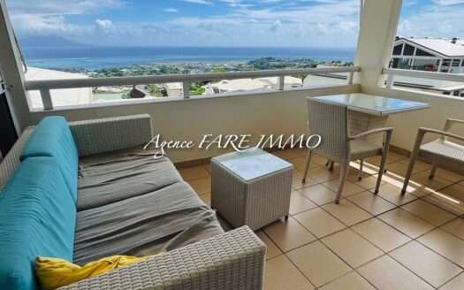 Situé au dernier étage d’une résidence récente avec ascenseur et piscine, appartement F3 de 65m2 hab, entièrement meublé équipé, fibre optique, 2 chambres climatisées, 1 salle d’eau, 1 wc indépendant, cuisine aménagée et équipée, salon séjour, terrasse couverte de 22m2 avec vue dégagée sur la mer et la vallée de Tipaerui.